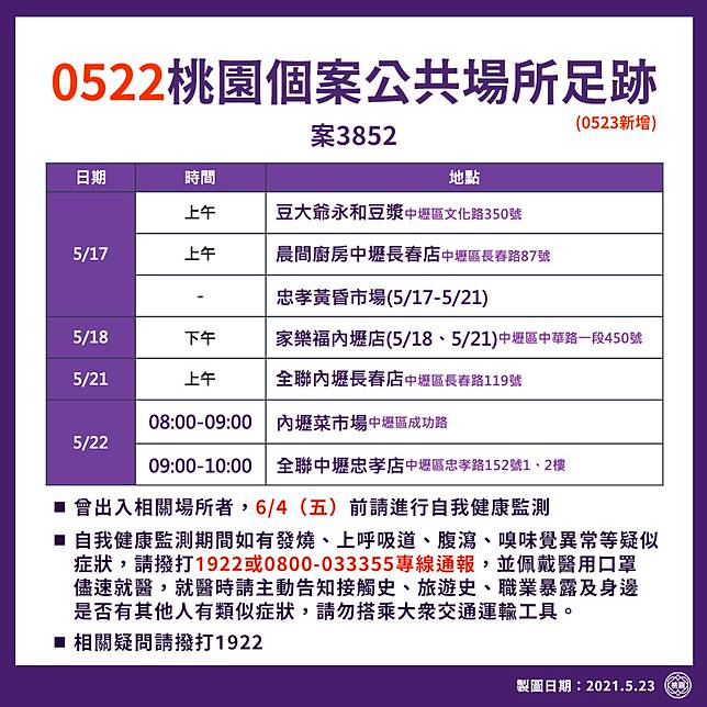 【 ⚠️ 0523公布桃園個案公共場所活動史 ⚠️ 】 市民朋友請注意!
